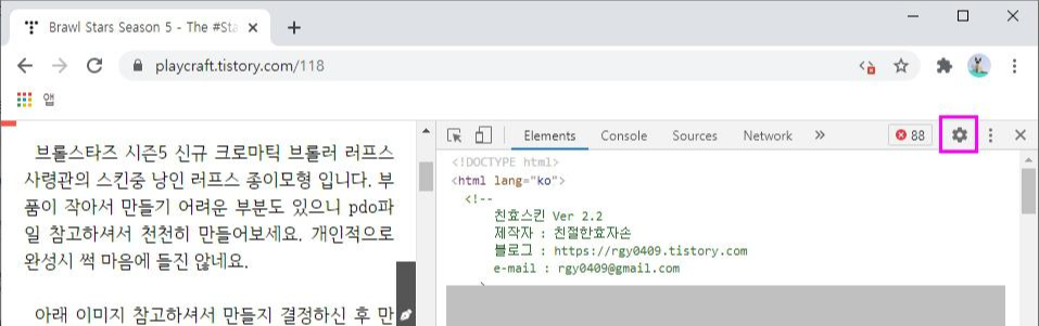 개발자 도구를 눌러주면 크롬에서 화면이 2개로 분리되면서 해당 화면을 구성하는 html 소스등이 나타납니다. 여기서 다른건 건드리지 마세요. 우측에 톱니바퀴 모양을 눌러주세요.