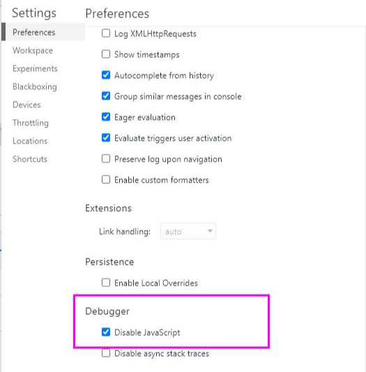 세팅창이 나오면 마우스 휠을 돌려서 설정 페이지를 아래로 쭉쭉 내리다 보면 Debugger 라는 메뉴가 있습니다. 여기서 Disable JavaScript 를 체크 합니다.