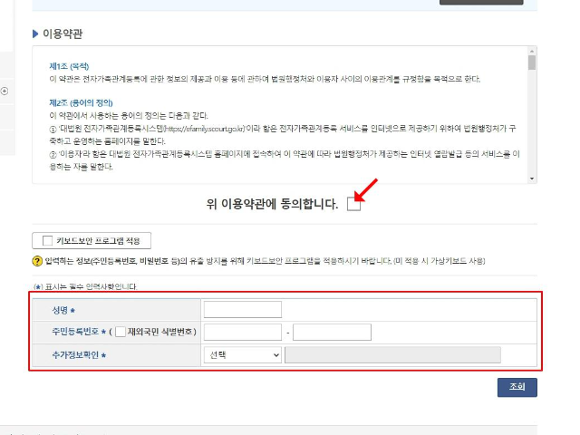 대법원 전자가족관계등록시스템 에 접속하면, 상단에 증명서 발급 메뉴에 가족관계 증명서 기본증명서가 있습니다. 선택해서 다음 화면으로 넘어갑니다. 약관에 동의 체크하고 필수 입력사항에 성명 주민등록번호 추가 정보 모두 입력하고 조회를 선택합니다.