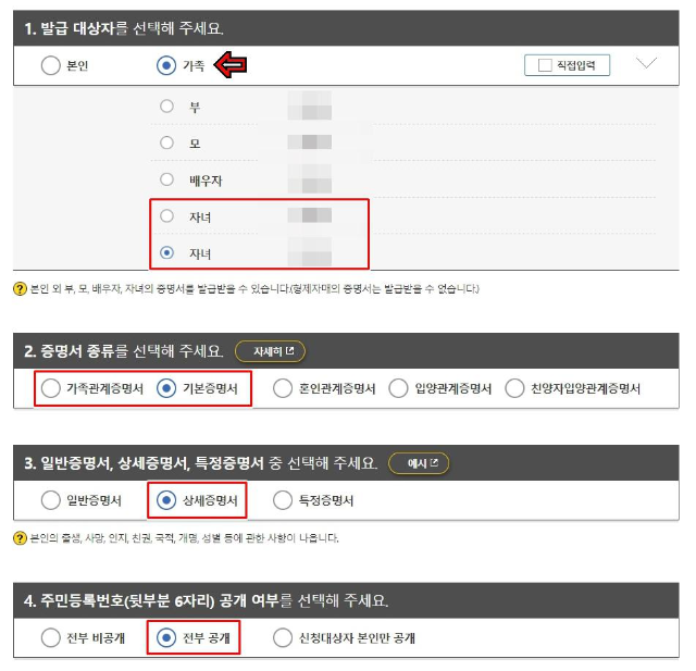 1. 발급 대상자(자녀 선택) ▶ 2. 증명서 종류(가족관계 or 기본) ▶ 3. 상세 증명서 ▶ 4. 주민등록번호 전부 공개