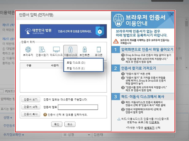 인증서 확인창이 나오면 본인의 인증서를 선택하고 본인이 설정한 공인인증서 암호를 입력합니다.