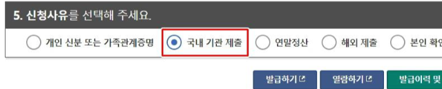 마지막으로 5. 신청사유를 선택한 후 [발급하기]를 선택하면 됩니다.