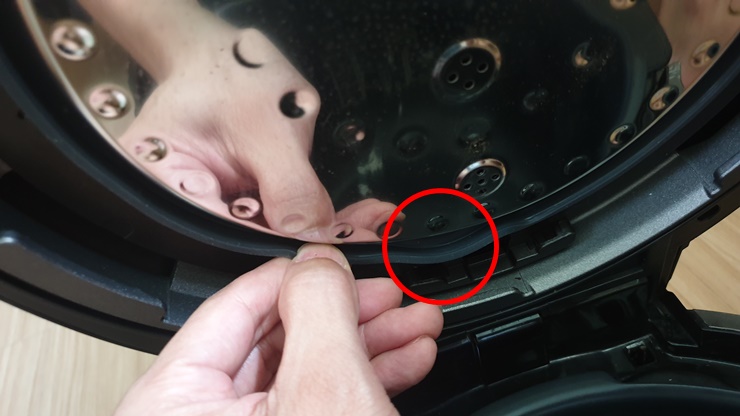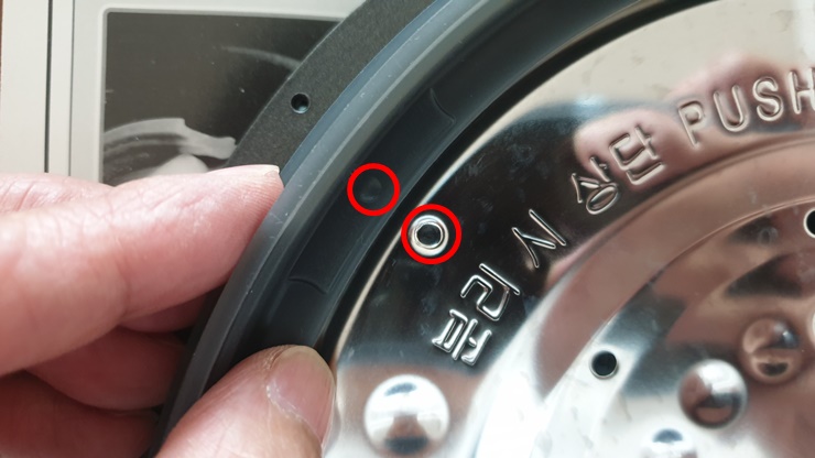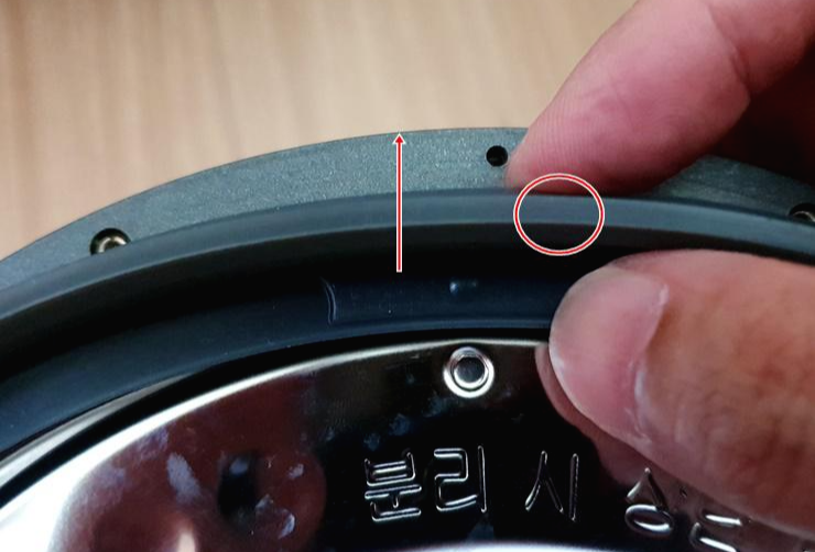 기존 사용하던 압력패킹을 다 제거해 주셨으면 이제 새 패킹을 장착하면 됩니다. 밥솥 뚜껑 쪽에 들어가는 내측패킹을 장착해주세요. 내측패킹에 아래 그림 동그라미 모양이 있는 부분이 안쪽으로 들어가게 끼우면 됩니다.