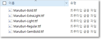 다운로드한 파일을 압축 해제하면 MaruBuriOTF 폴더와 MaruBuriTTF 폴더에 각각 5개의 파일이 있습니다.