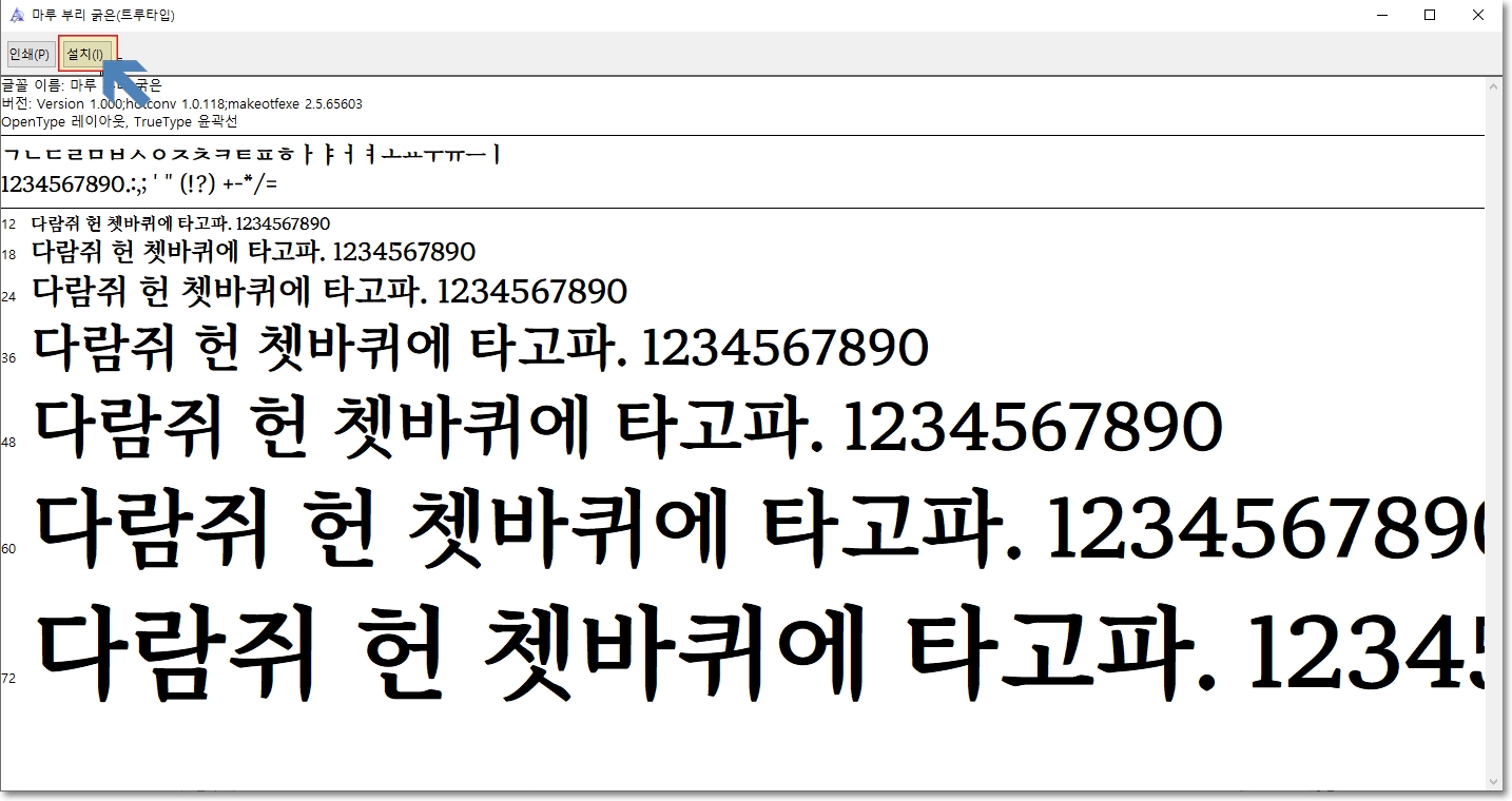 폰트 설치는 원하는 굵기의 폰트를 더블 클릭하고 설치를 선택합니다.