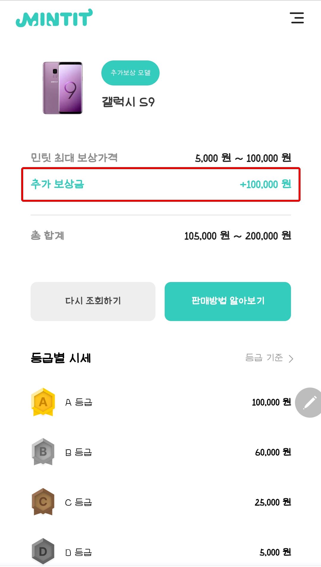 여기에 마지막으로 아들이 사용 중인 S9 민팃하면 액정 잔상으로 C등급 받을 거 같으니 25,000원에 추가 보상 100,000원 해서 총 125,000원입니다.(참고로 이번 민팃 추가 보상은 노트 9가 혜자입니다. 추가 보상 150,000원. 그래서 그런지 노트 9 액정 깨진 폰을 50,000원에 사시려는 분들이 많은 거 같습니다.)