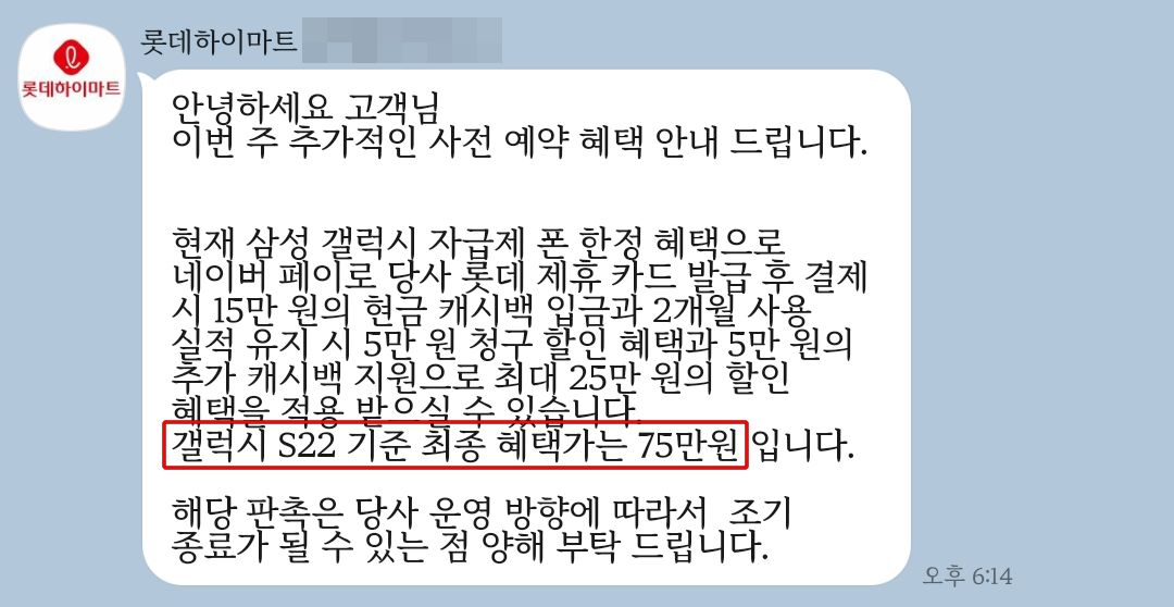 하이마트 카톡 문의해보니 최종 혜택가가 75만 원으로 괜찮아 보이고, 버즈 2 패키지로 하면 혜택이 더 괜찮아지겠지만 신규 카드 발급 조건과 2개월 실적 유지를 해야 하고 삼성 케어 자부담 8만 원 미지원이라 일렉트로마트를 1순위로 정했습니다. (참고로 롯데하이마트도 민팃 지원한답니다.)