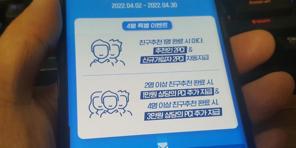 3월에 10명 추천 시 3만 원 상당의 PCI를 추가 지급했었는데, 4월은 4명만 친구 추천해도 3만 원 상당의 PCI를 받을 수 있는 혜자 이벤트입니다.
