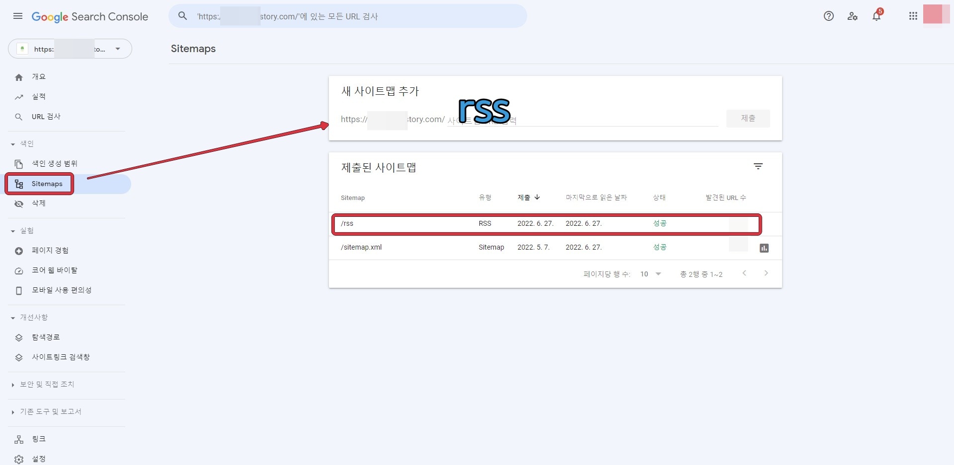 이처럼 사이트맵과 rss가 정상적으로 제출되면 됩니다.