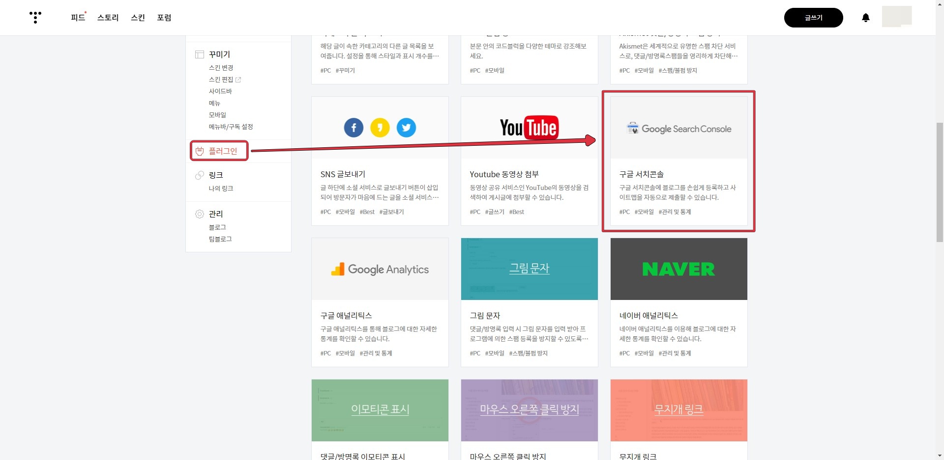 좌측 메뉴에서 플러그인을 선택하고 구글 서치 콘솔을 찾아 선택합니다.