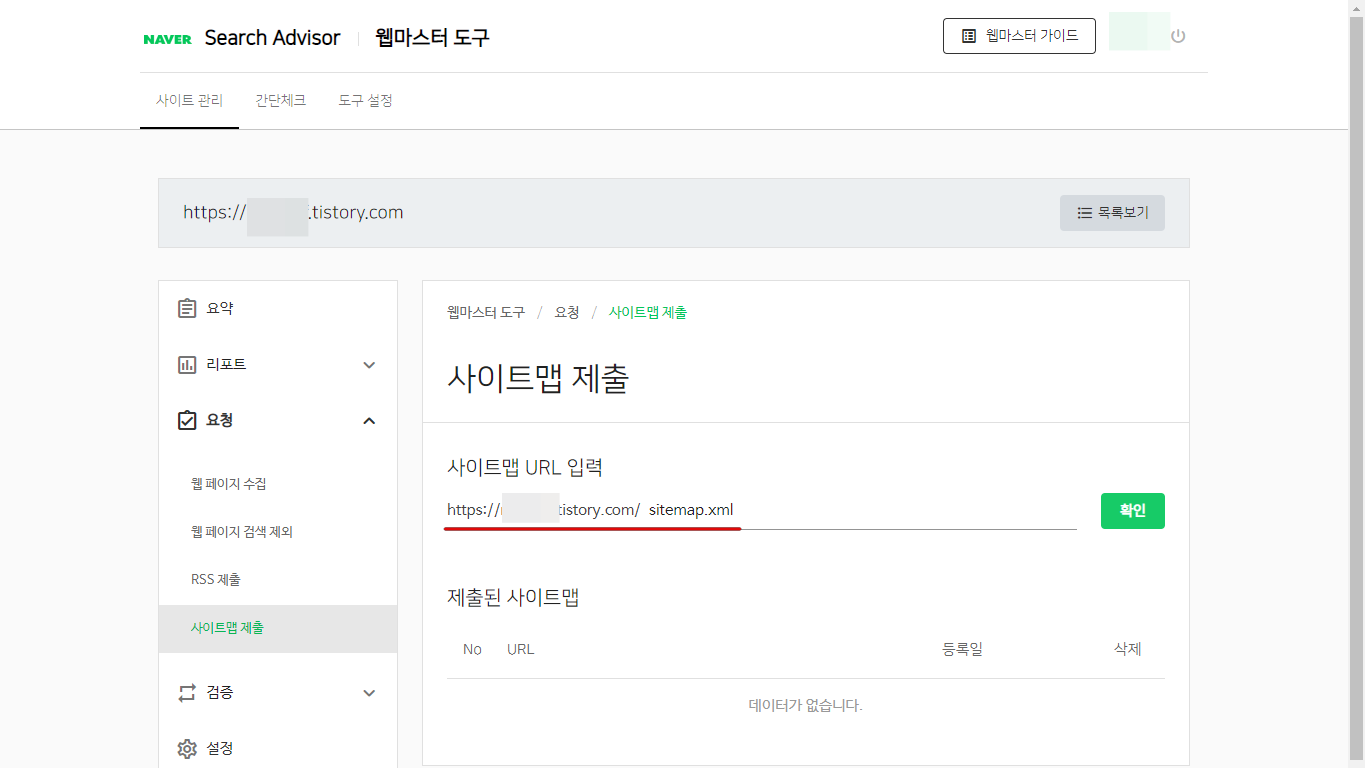 사이트맵 제출을 선택하고 사이트맵 URL 입력란에 본인의 사이트 주소를 입력하고 마지막에 sitemap.xml을 추가합니다.