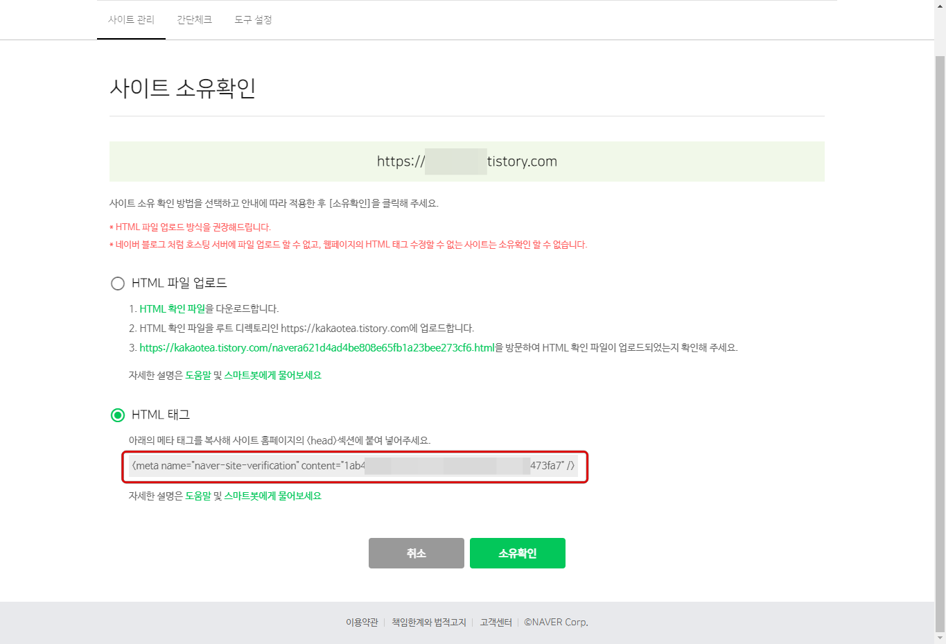 사이트 등록 추가하면 등록할 사이트가 본인 사이트인지 확인 절차를 거치게 됩니다. 사이트 소유확인은 메타태그를 본인의 티스토리 html 태그에 넣어주면 됩니다.