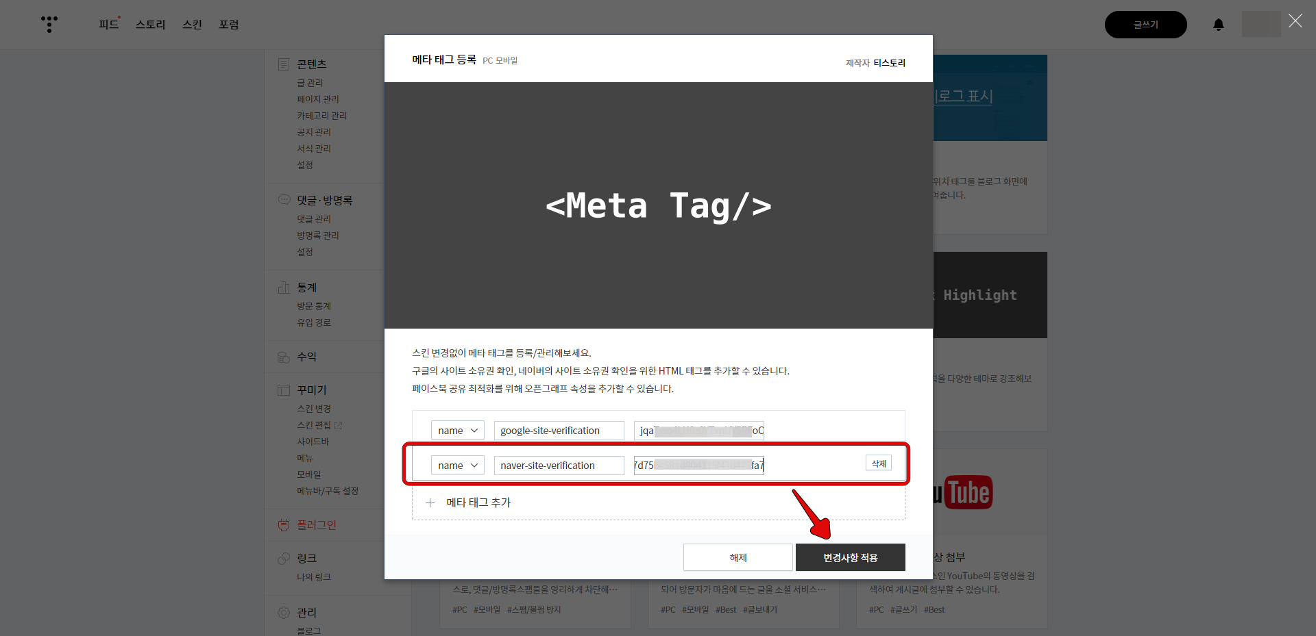 메타 태그 추가를 선택하고, 첫 번째 공란(이름을 입력하세요)에는 name "naver-site-verification" 를, 두 번째 공란(내용을 입력하세요)에는 content "1ab##3fa7" 내용 중 따옴표 안에 문장을 복사해서 넣어주고 변경사항 적용을 해주면 됩니다.