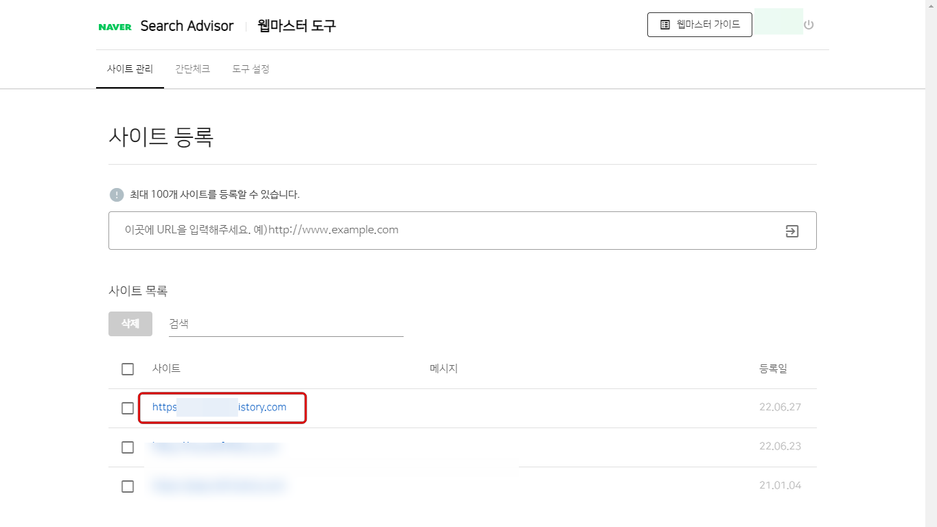 본인의 티스토리 사이트 주소를 입력합니다. 한 가지 주의하실 부분은 티스토리 본인 블로그 주소 입력 시 http://이 아닌 https:// 로 입력합니다.