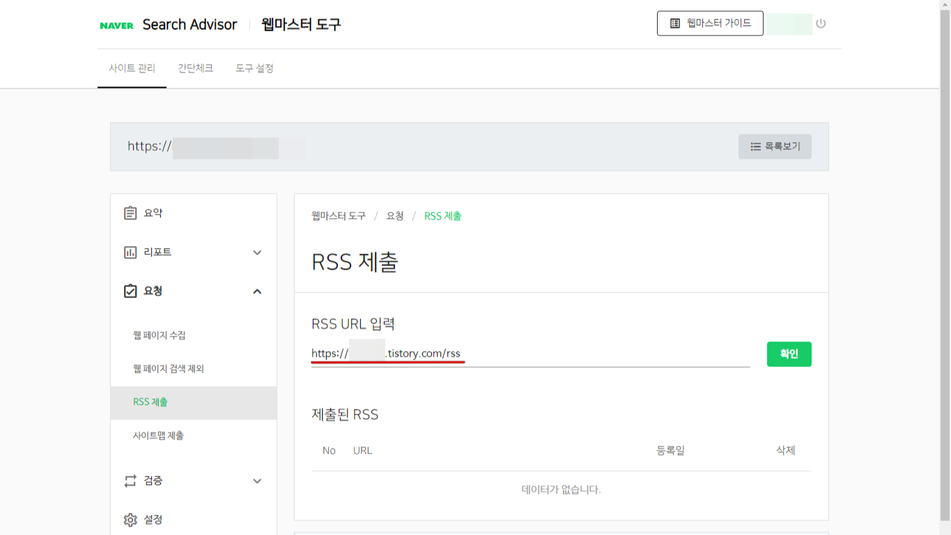 요청 메뉴에 RSS 제출을 선택하고 RSS URL 입력란에 본인의 사이트 주소를 입력하고 마지막에 RSS를 추가하고 확인을 누릅니다.