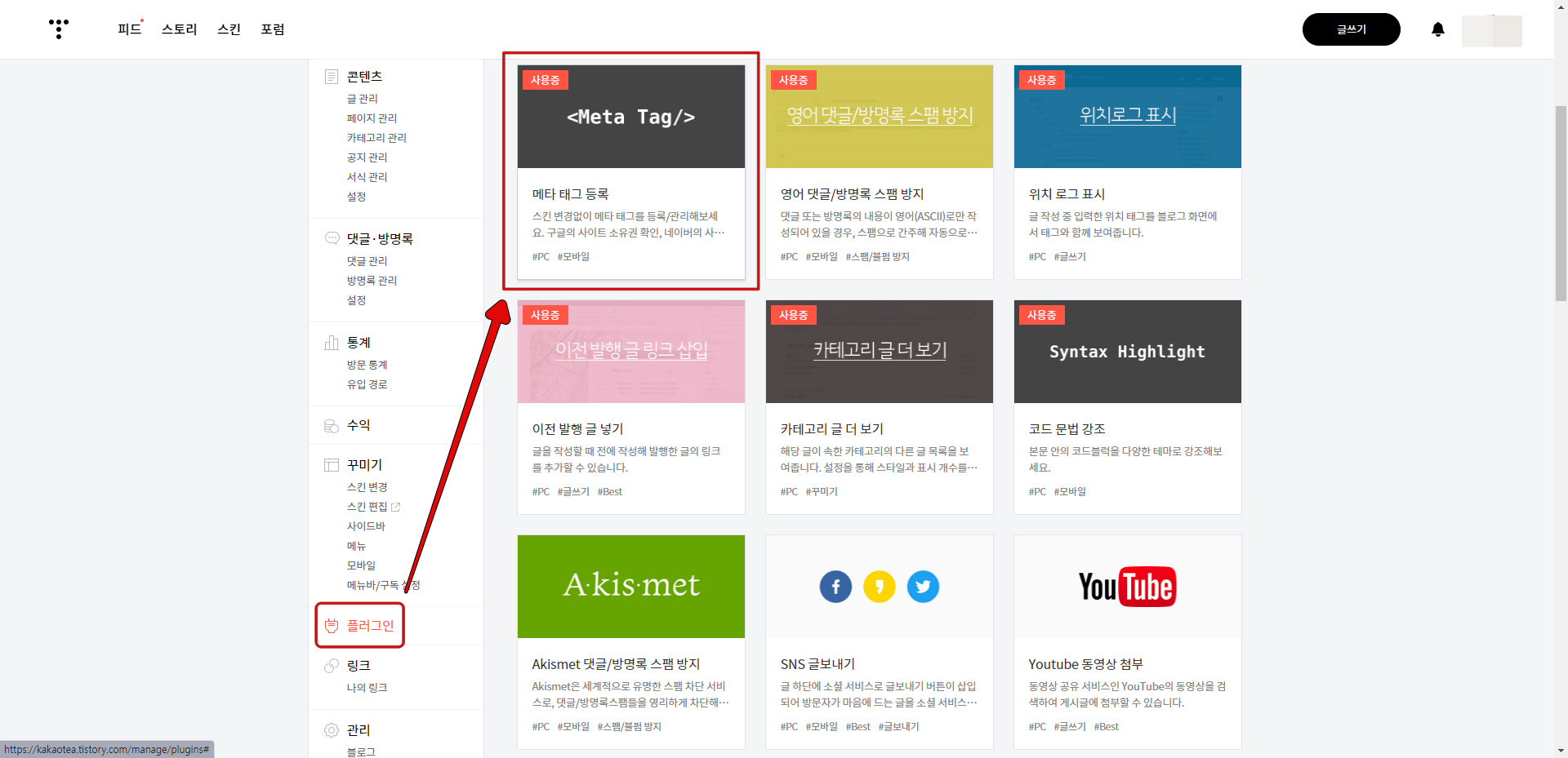 HTML 태그를 선택하고 아래의 메타 태그를 복사해서 홈페이지의 (head) 섹션에 붙여 넣어주거나 이 상태로 두고 크롬 새창을 띄워 티스토리 블로그 관리자 모드로 들어갑니다. 관리자 모드에서 플러그인을 선택하고 메타태그를 찾아 클릭하세요.