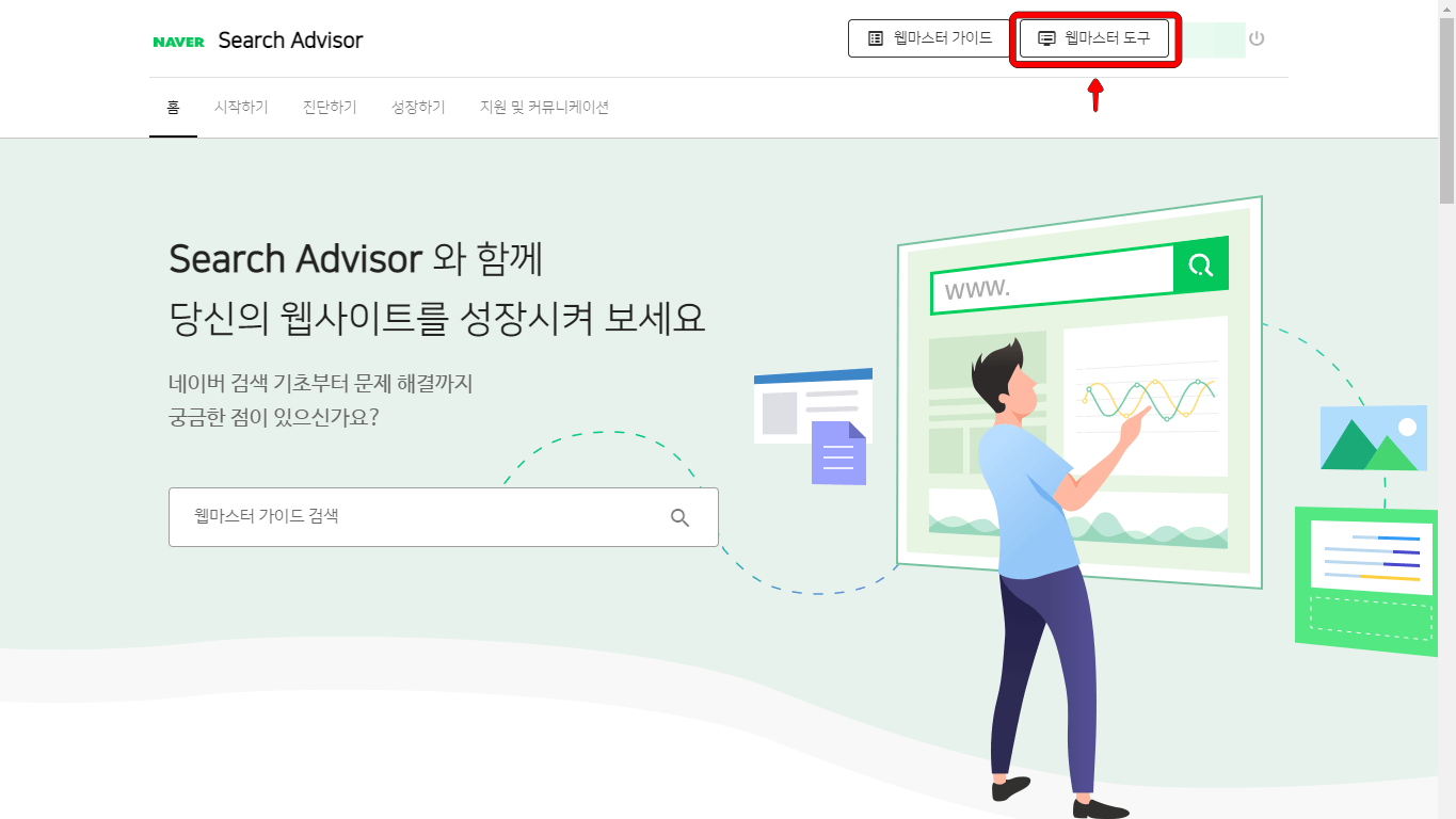 네이버 서치어드바이저에 접속합니다. 로그인 상태에서 웹마스터 도구를 클릭하세요.
