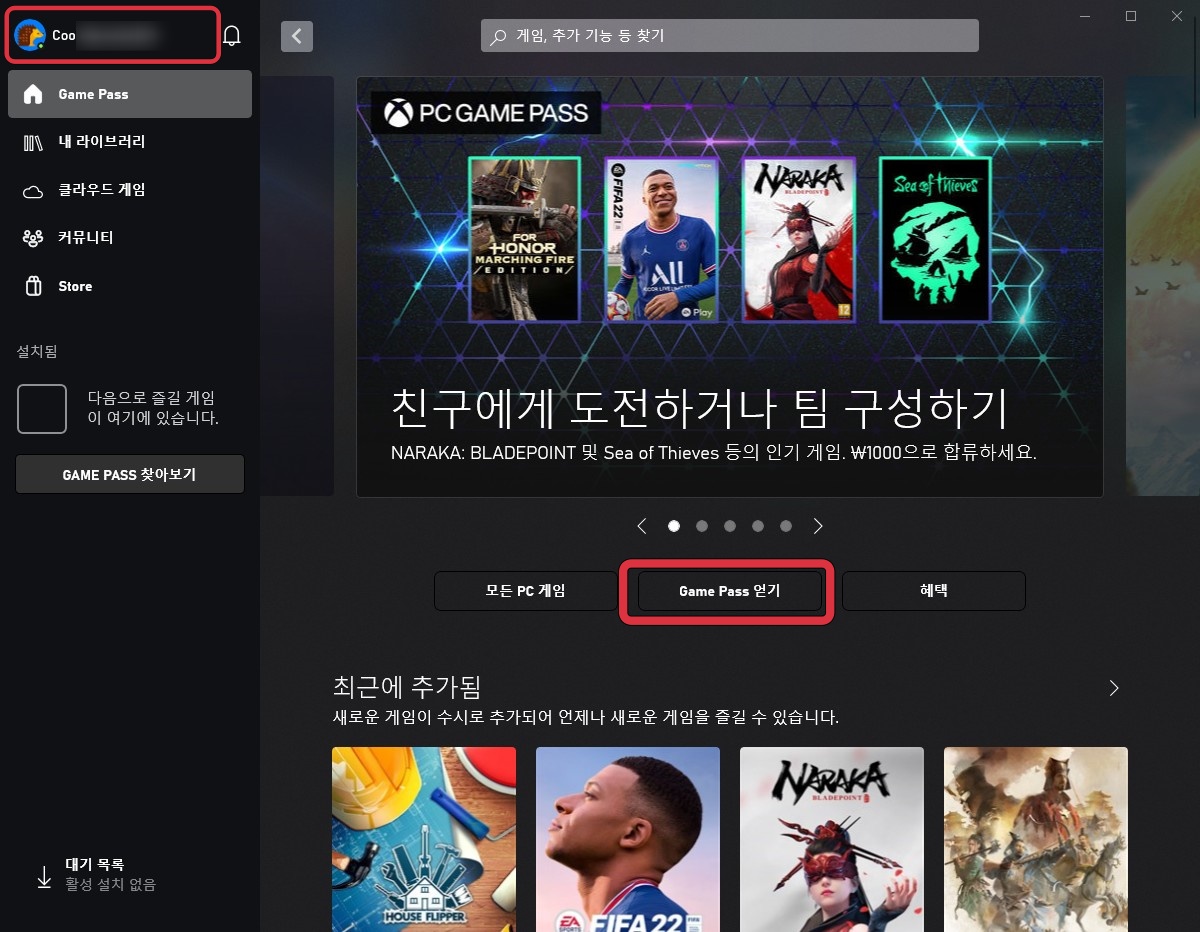 PC에서 XBOX 앱을 실행하여 로그인하면 Game Pass 얻기를 선택하여 게임 패스를 가입 진행하시면 됩니다.