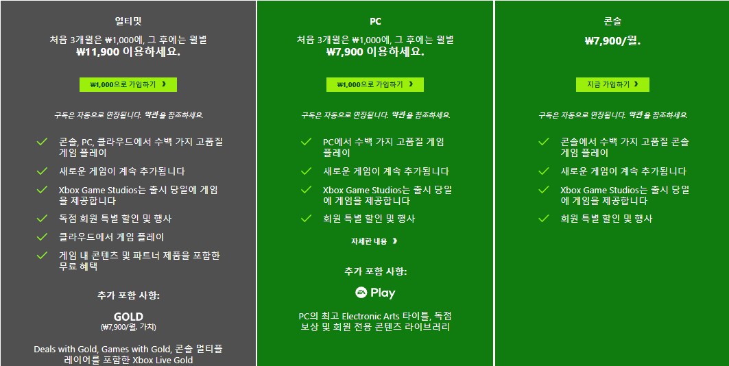 Microsoft에서 2017년 6월 1일부터 정식 서비스를 지원하고 있으며. 월 7,900원에 게임 패스 목록에 올라간 게임을 무제한으로 플레이할 수 있습니다. 또한 Xbox Game Pass 멤버들은 Xbox Game Pass 라이브러리에서 게임을 최대 20% 할인된 가격에, 게임 관련 추가 기능 및 소모품을 최대 10% 할인된 가격에 구매할 수 있습니다.*