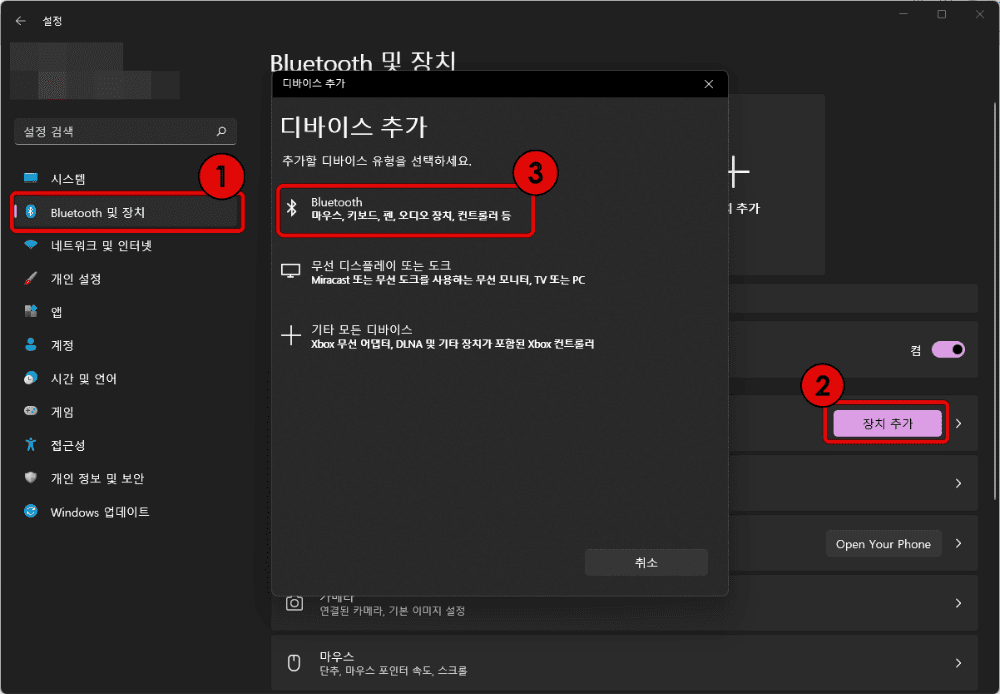 ①Bluetooth 및 장치에서 ②장치 추가를 선택합니다. 디바이스 추가 창이 뜨면 ③Bluetooth를 선택합니다.