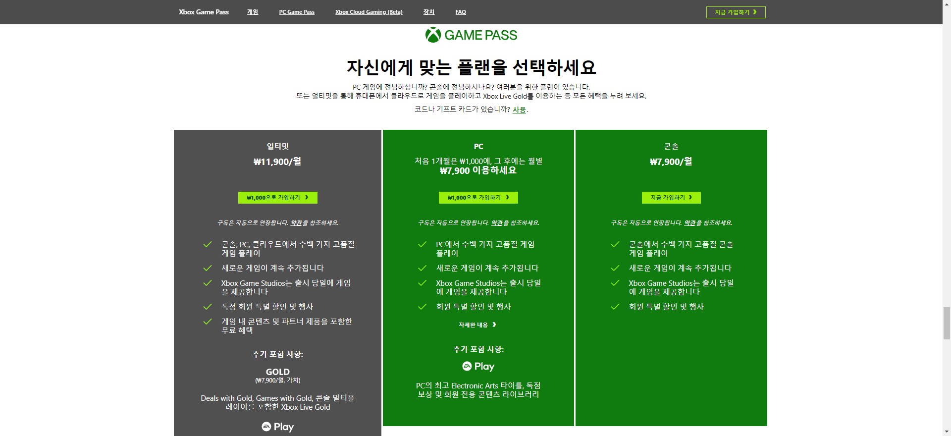 콘솔용 게임패스에는 멀티플레이를 지원하는 라이브 골드가 들어있지 않기 때문에 멀티플레이를 하시려면 얼티밋을 구매하는 게 좋습니다. PC에서 멀티플레이는 라이브 골드가 필요 없으니 PC로만 즐기실 분은 PC용만 구독하셔도 됩니다. 첫 가입시 첫 달 1,000원에서 이용해 보실 수 있으니 얼티밋으로 가입해서 한 달간 PC에서 무제한 플레이해보세요.