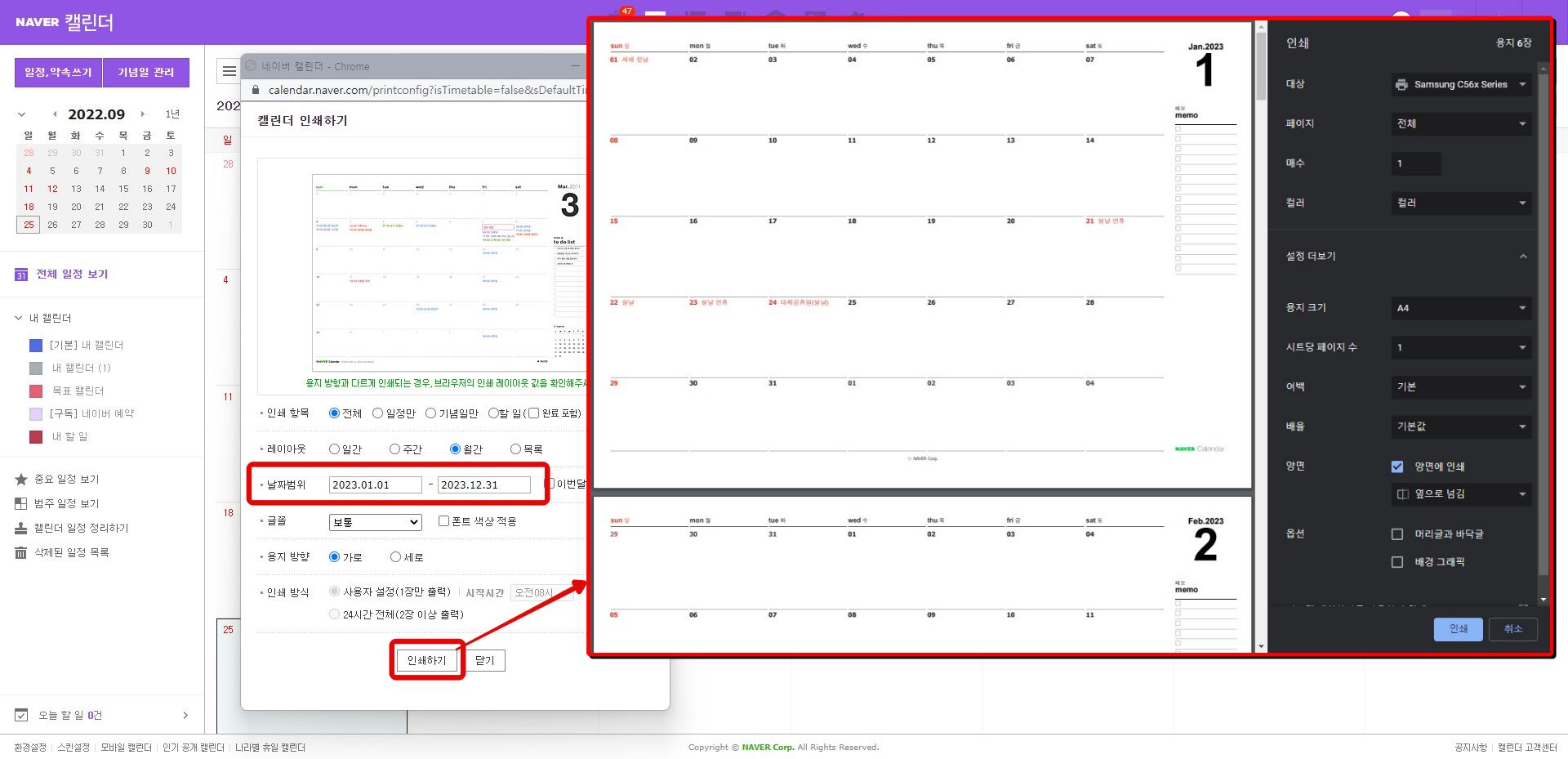 사실, 내년 달력을 월별로 메모 가능하게 만들어 달라는 요청이 있어 대충 검색으로 다운로드하여서 출력해 주려고 알아보니 딱히 마땅한 걸 찾지 못했습니다. 그러다 네이버 캘린더에서 출력할 수 있는 아주 간단한 방법이 있는 걸 알게 되었습니다. 네이버 아이디 있으면 바로 출력 가능하니 필요한 분들은 네이버 캘린더를 이용해 보세요.
