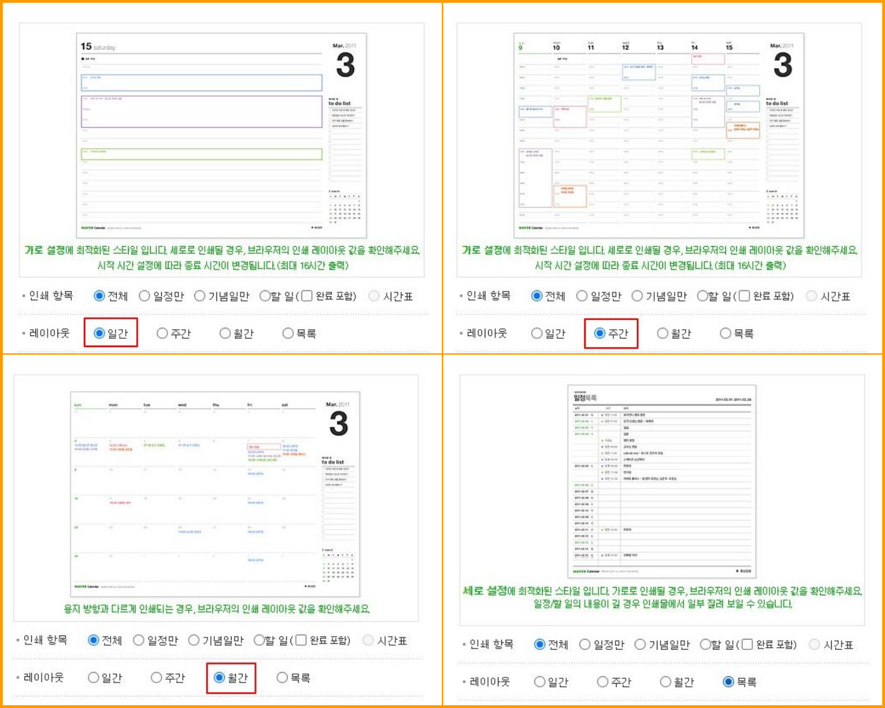 레이아웃은 일간, 주간, 월간, 목록으로 선택할 수 있으면 미리보기를 통해 확인할 수 있습니다.