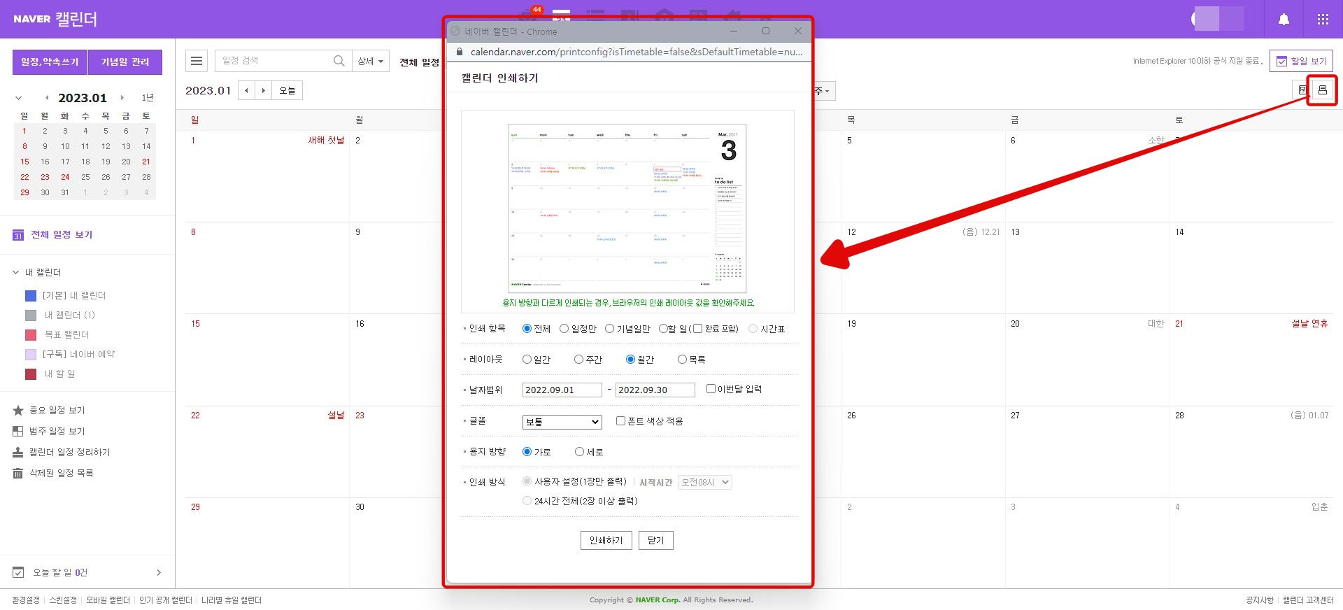 네이버 캘린더를 방문하고 로그인합니다. 오른쪽 상단의 프린터 아이콘을 선택하고 원하는 레이아웃으로 인쇄하면 됩니다. 엄청 간단합니다.