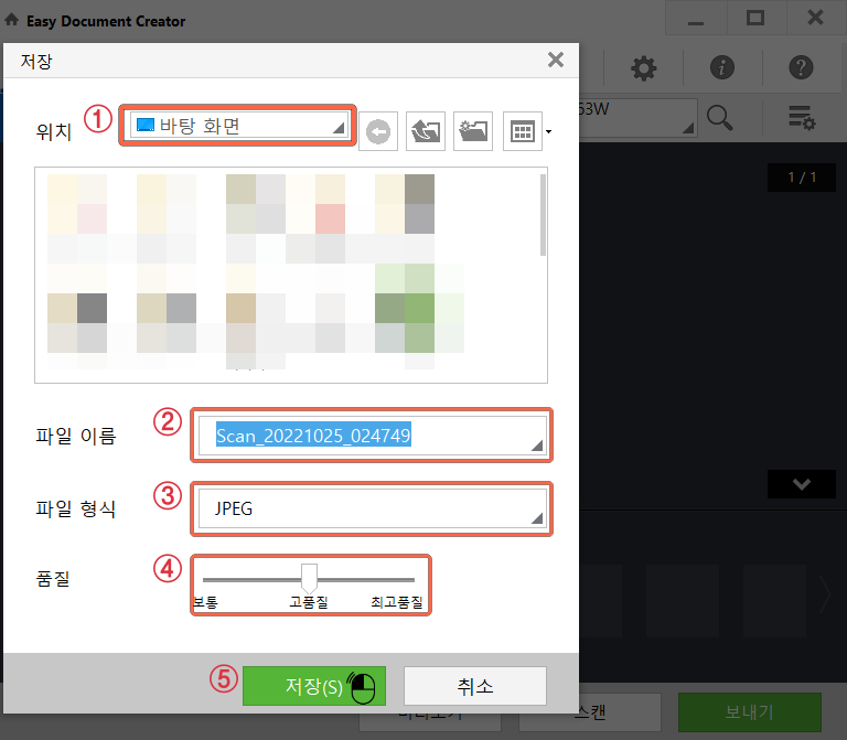 6. 보내기 팝업창이 뜨면 [내컴퓨터]를 선택하고 [확인]을 누릅니다. 저장 팝업창에서 저장 위치(①), 파일 이름(②), 파일 형식(③), 품질(④)을 선택하고 저장(⑤)을 선택합니다.