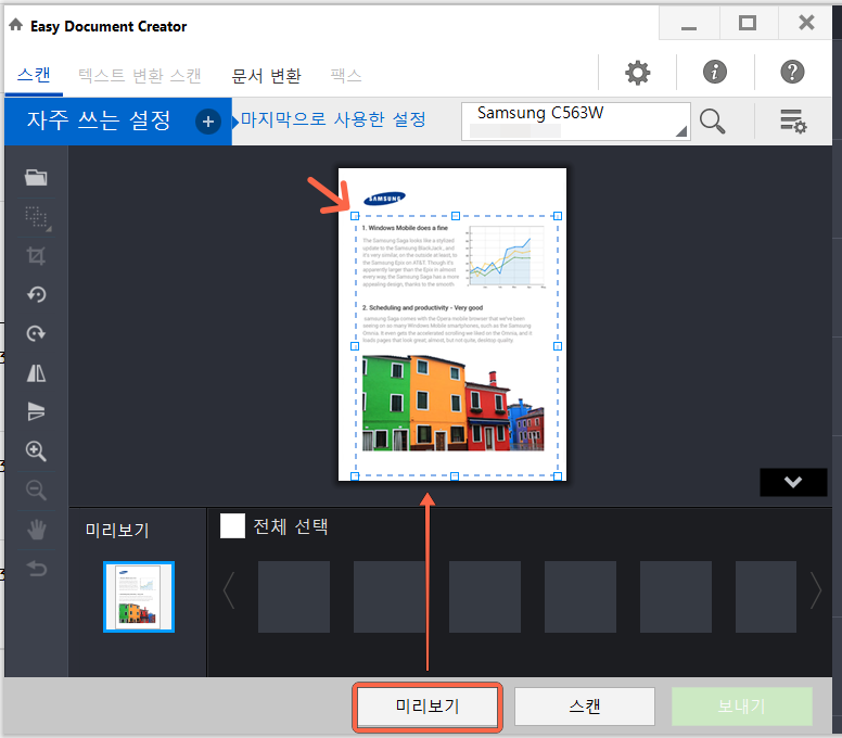 5. 스캔 전에 미리 보기 버튼을 선택하여 미리보기 이미지를 확인합니다. 미리 보기 이미지에서 테두리를 조절하여 스캔 영역을 지정할 수 있습니다.