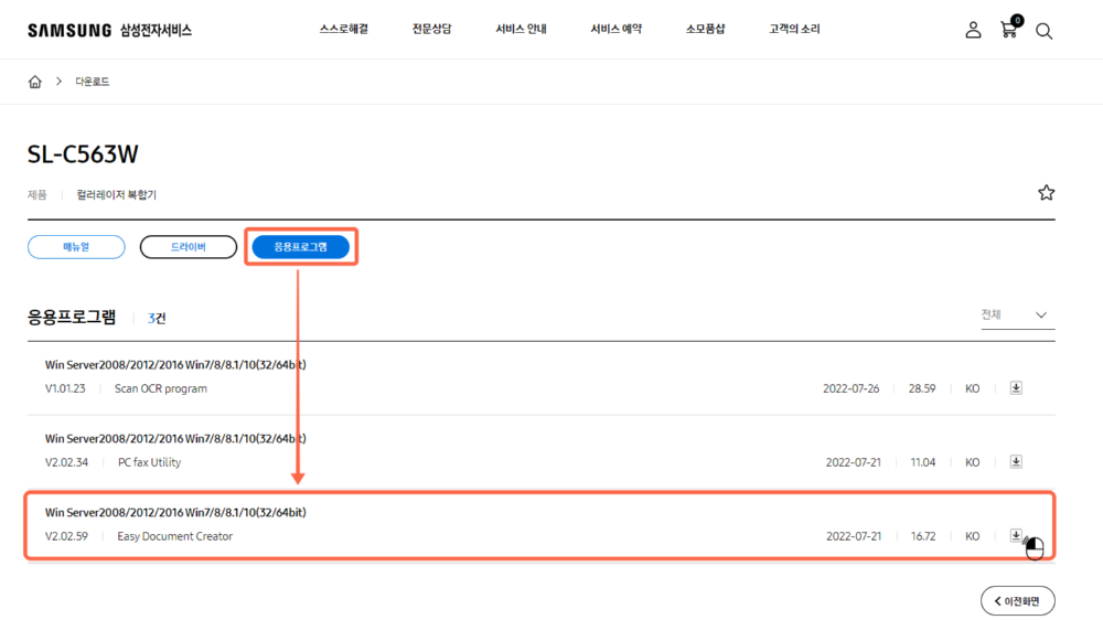 3. 다음으로 응용프로그램 메뉴를 선택하고 현재 사용하는 운영체제에 맞는 Easy Document Creator 프로그램을 다운로드하여 설치합니다.