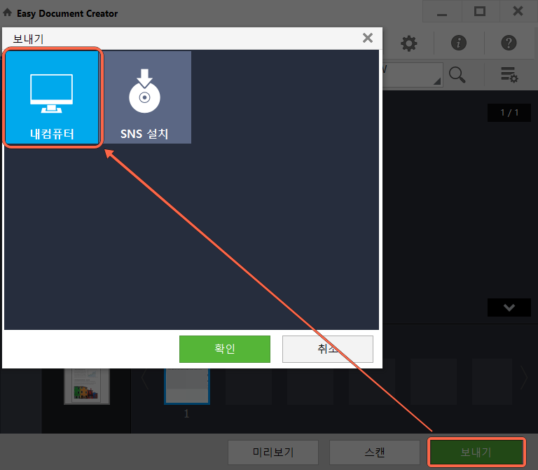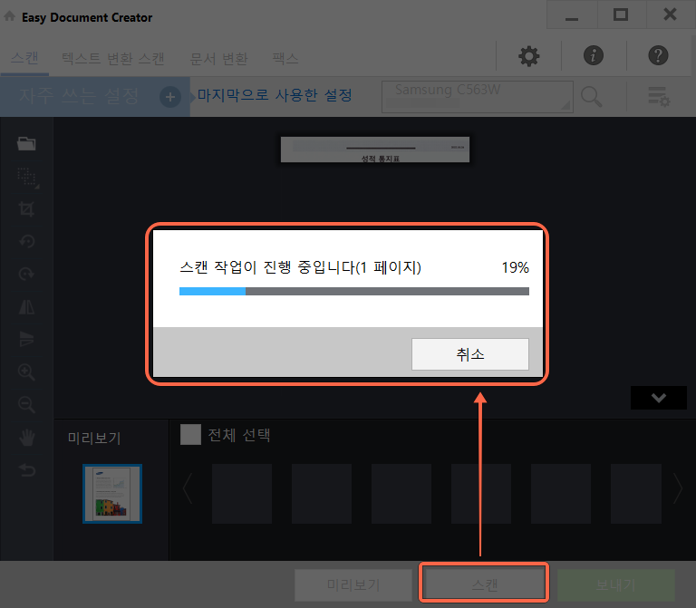 5. 스캔 버튼을 누르면 스캔 작업이 진행됩니다. 스캔이 완료되면 보내기 버튼을 누릅니다.