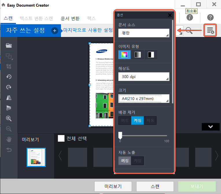 4. 옵션 아이콘을 선택하면 문서 소스, 이미지 유형, 해상도, 크기 등의 옵션을 변경할 수 있습니다.