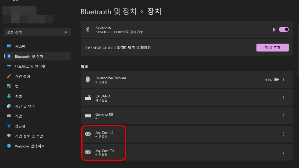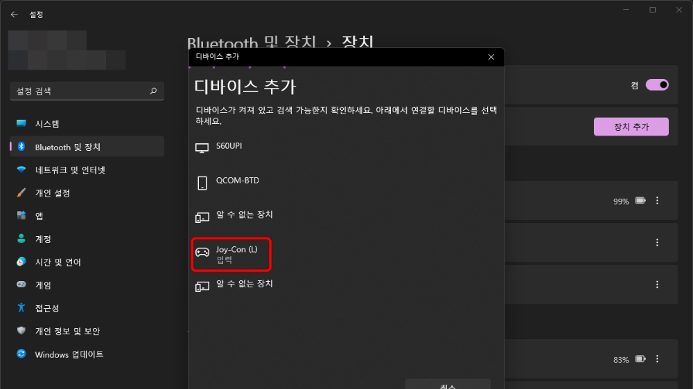③ 잠시 후 윈도우 디바이스 추가에 Joy-Con (L) 혹은, Joy-Con (R)이 검색됩니다. Joy-Con(L/R)을 선택하여 페어링 합니다.