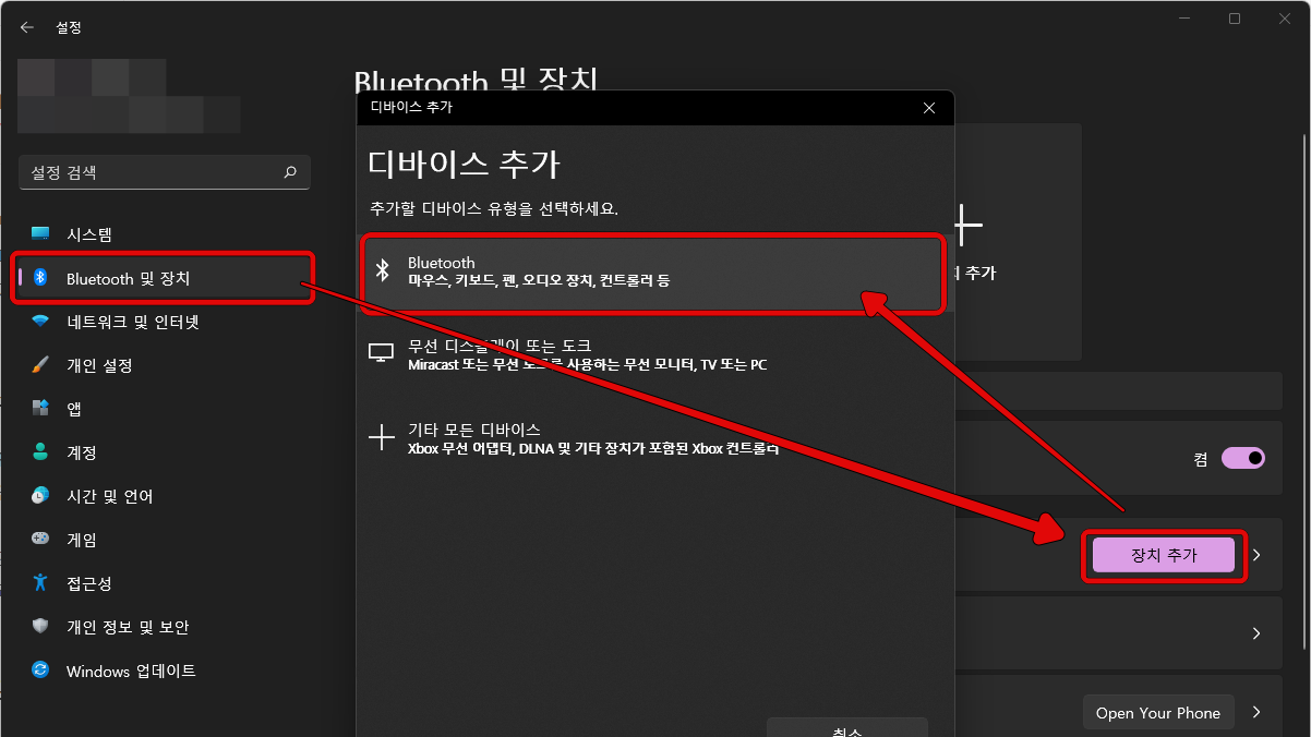 ① 윈도우 설정(단축키 : 윈도우키 + i)을 열고 Bluetooth 및 장치를 선택합니다. 장치추가를 눌러 디바이스 추가 > Bluetooth를 선택합니다.