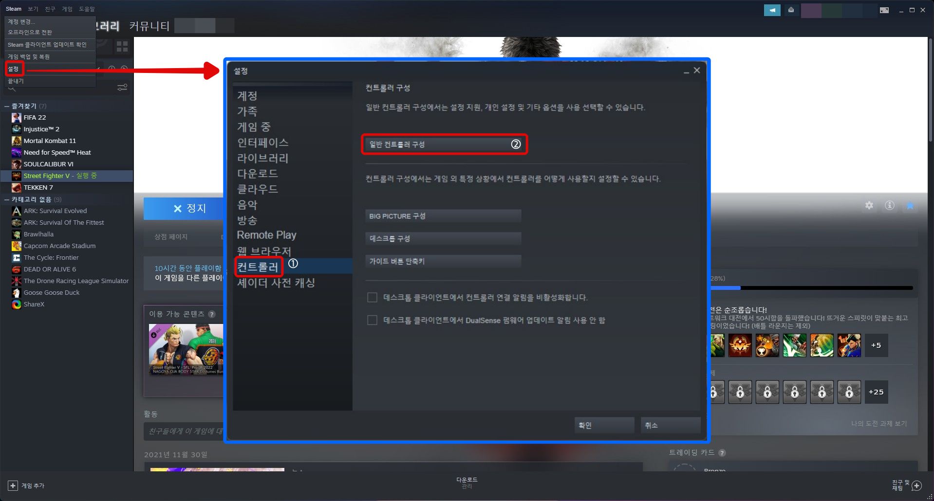 ① 스팀설정창에서 컨트롤러 > 일반 컨트롤러 구성을 선택합니다.