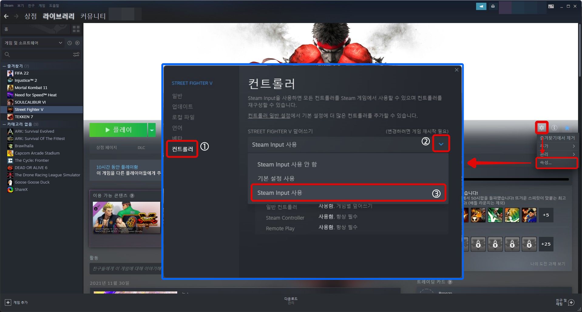 게임별 설정에서 속성 > 컨트롤러(①)로 진입합니다. 기본설정 사용으로 되어있다면 화살표(②)을 눌러 Steam Input 사용(③)으로 변경합니다.