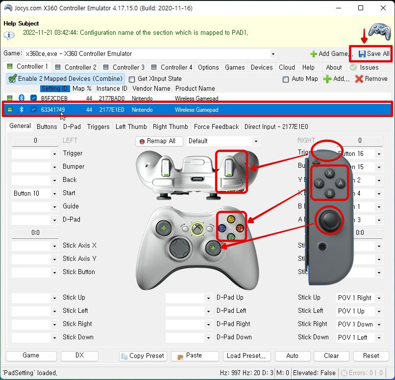 Select / Start 버튼도 -/+ 버튼으로 설정하고 모든 버튼 설정이 끝나면 Save All 버튼을 눌러 설정을 저장합니다. CPU 사용을 줄이기 위해 Xbox 360 컨트롤러 에뮬레이터를 최소화합니다(프로그램 아이콘이 트레이에 표시됨). 게임을 실행하고 작동 방식을 확인합니다.