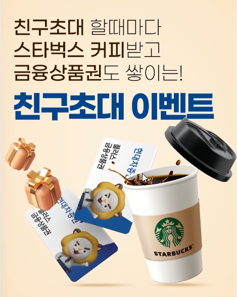 현대차 증권에서 만든 자산관리 애플리케이션 허브에 가입하세요. 신규 가입하고 자산 1개만 연결해도 스타벅스 아메리카노 Tall 쿠폰을 100% 증정합니다. 신규 가입 후 추천인 코드를 입력해야 스타벅스 커피 쿠폰을 받을 수 있으니 꼭 추천인 코드 넣는 걸 잊지 마세요. 또한 친구 추천 수에 따라 현대차증권 금융 상품권 최대 3만 원까지 증정합니다. 자세한 이벤트 내용 알아볼게요.