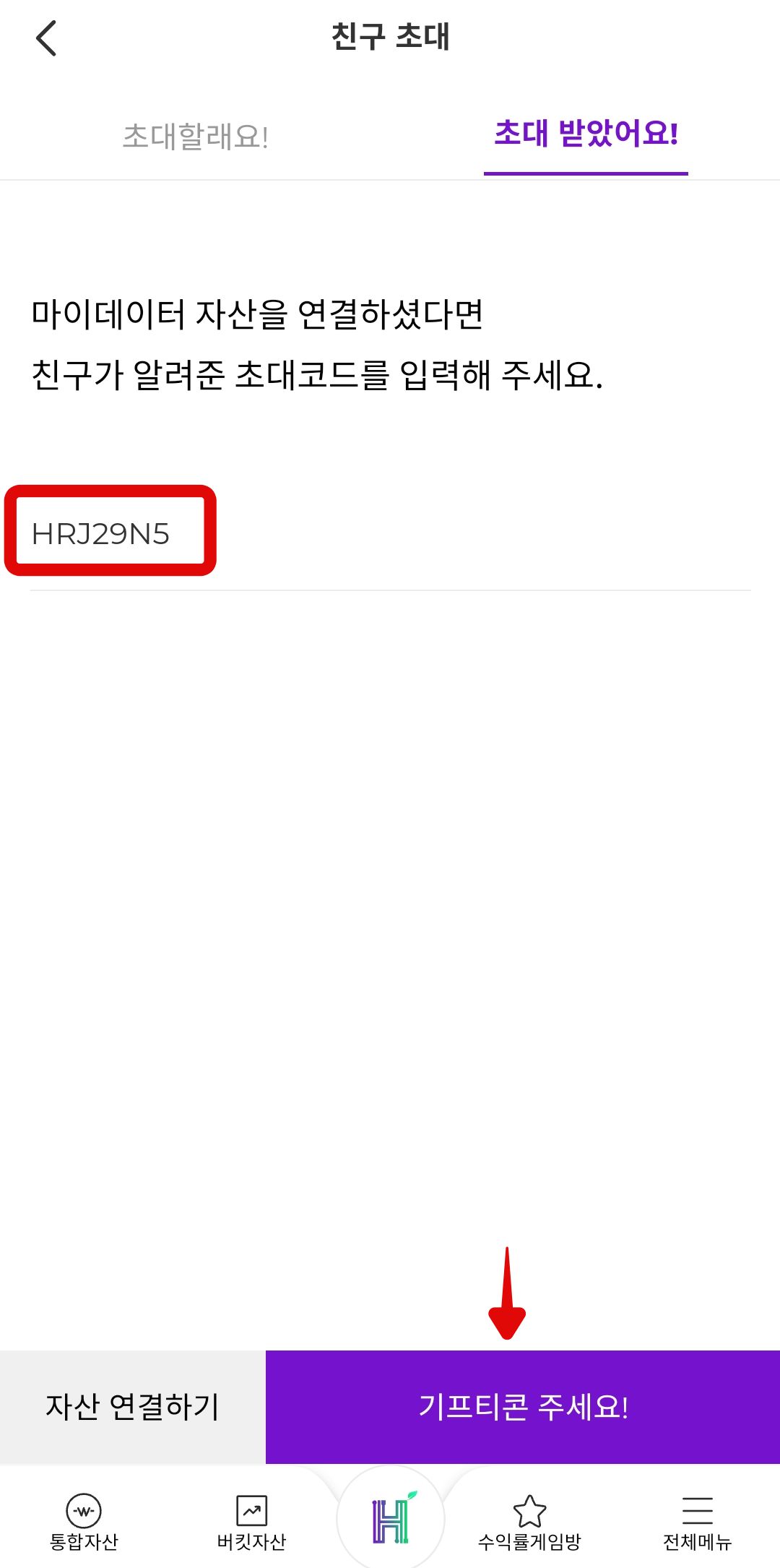 5. 초대받았어요! 를 선택하고 친구 초대 코드(HRJ29N5)를 입력한 후 기프티콘 주세요를 선택하면 됩니다.
