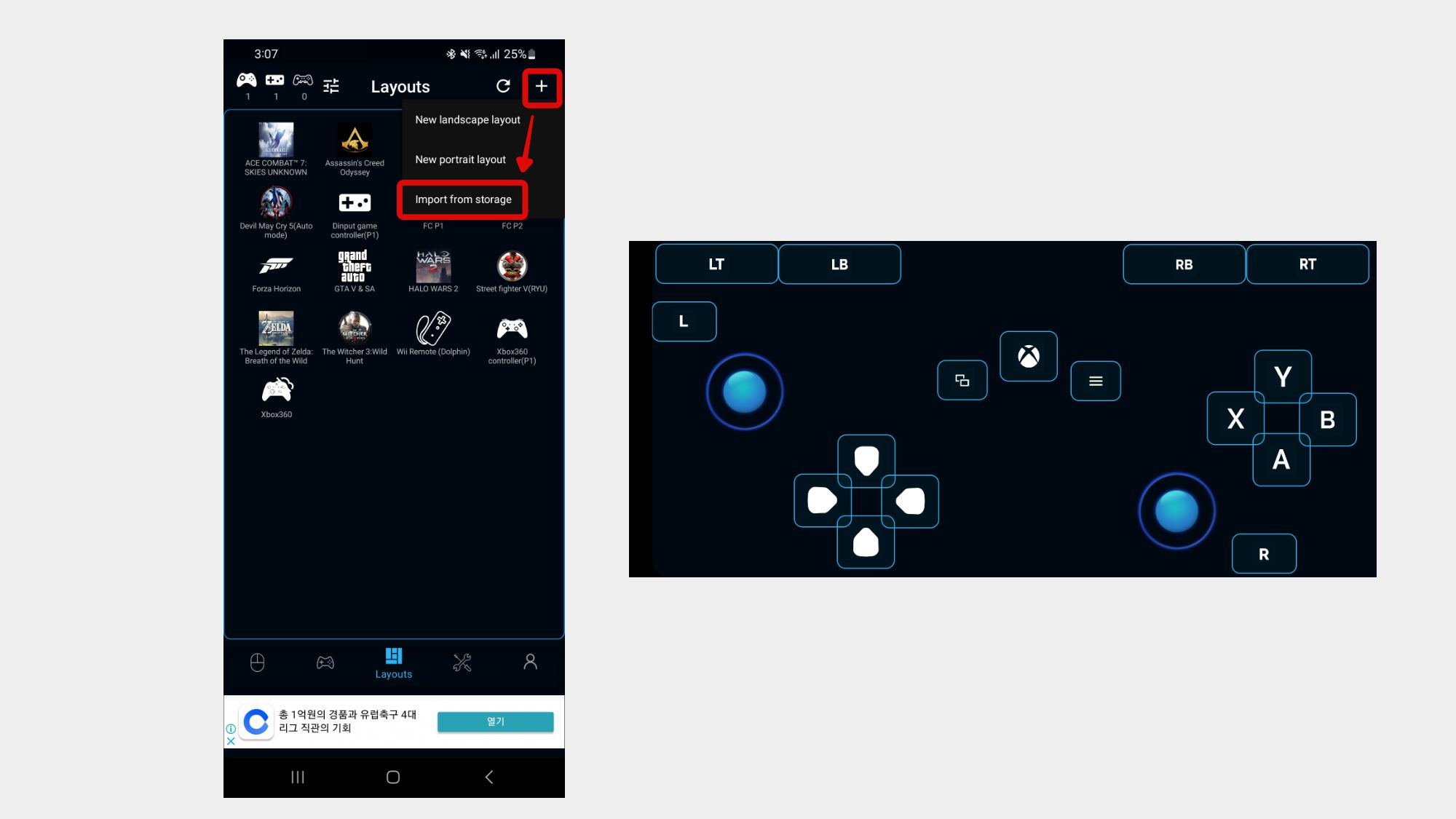 위 다운로드 페이지에서 두 번째 Xbox360 파일을 다운로드하고 PC Remote 앱 하단 Layouts 메뉴에서 + 버튼을 누르고 Import from storage를 선택하여 다운로드한 파일을 찾아서 선택하면 아래와 같은 레이아웃이 적용됩니다.