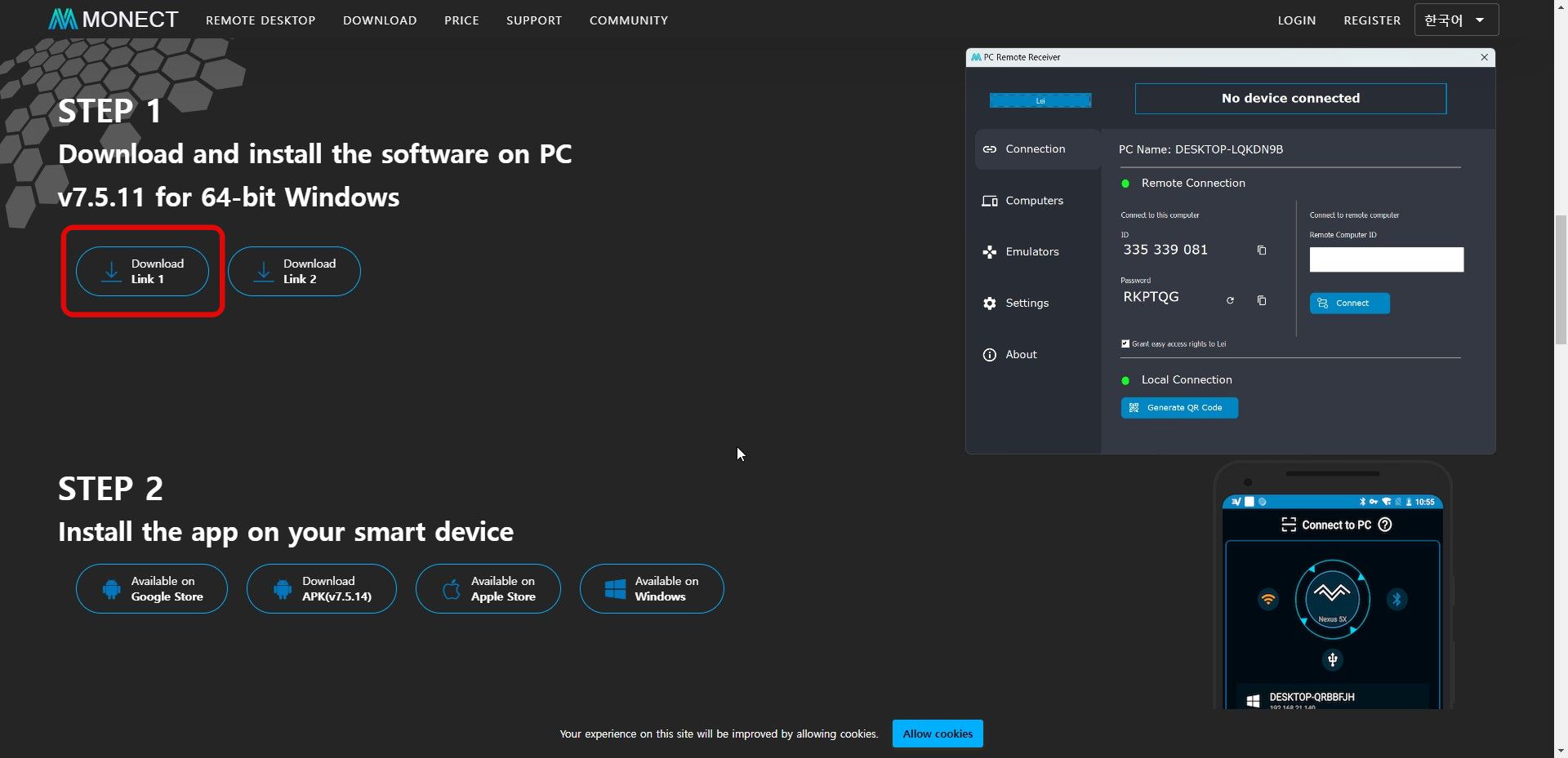 먼저, 스마트폰을 가상의 게임 패드로 인식하게 만들려면 스마트폰에는 PC REMOTE 앱을 설치하고 PC에도 프로그램을 설치해야 합니다. 아래의 절차에 따라 PC와 스마트폰에 프로그램과 앱을 모두 설치합니다.