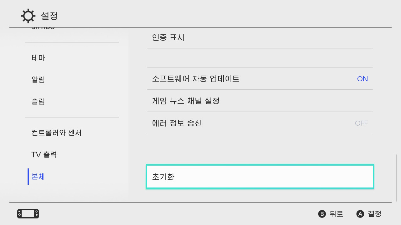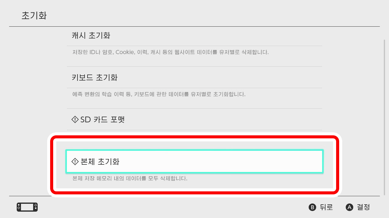 닌텐도 스위치를 판매하기 전에는 반드시 본체 초기화를 해야 합니다. 초기화를 진행하면 본체 저장 메모리에 있는 소프트웨어 데이터, 저장된 게임 기록, 화면 사진·동영상, 유저 정보 등이 모두 삭제됩니다. 또한 microSD 카드에 저장된 소프트웨어 데이터도 사용할 수 없게 되니, 초기화 전 중요한 데이터는 반드시 백업하세요.