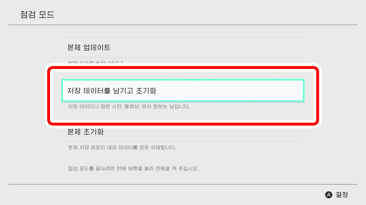 ● 「저장 데이터를 남기고 초기화」를 선택하고 화면의 안내에 따라 초기화해 진행합니다.
