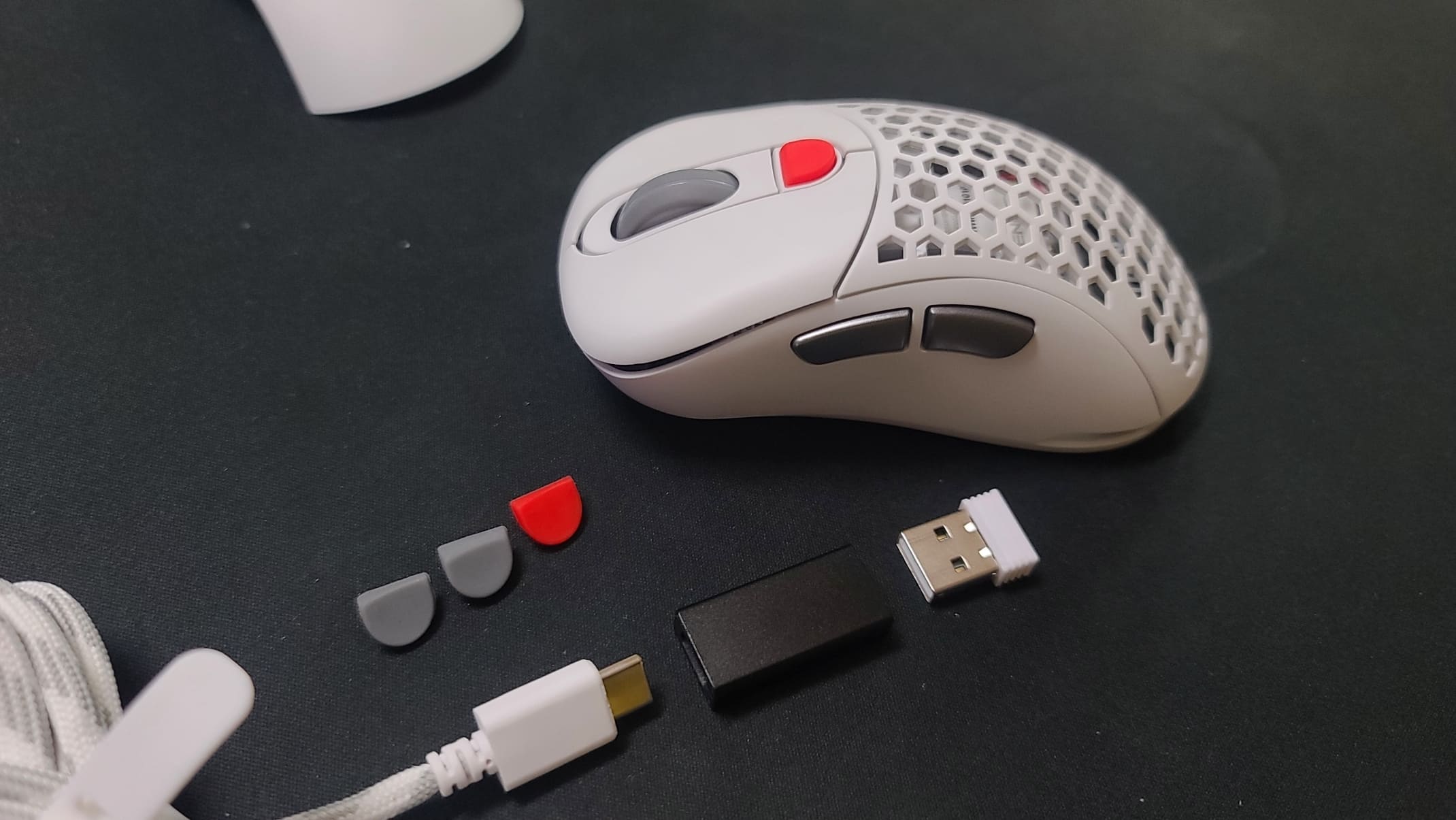 기본 구성품을 살펴보겠습니다. 타이탄 G 에어 SE 본체, 매뉴얼, 교체용 팜 커버, USB C타입 유선 케이블, 2.4G 어댑터, 동글 연장 케이블, DPI 교체용 고무 버튼으로 구성되어 있습니다. 제품 색상은 블랙과 화이트 2가지 색상으로 선택할 수 있으며, 저는 블랙과 화이트 각각 1개씩 구매했습니다.