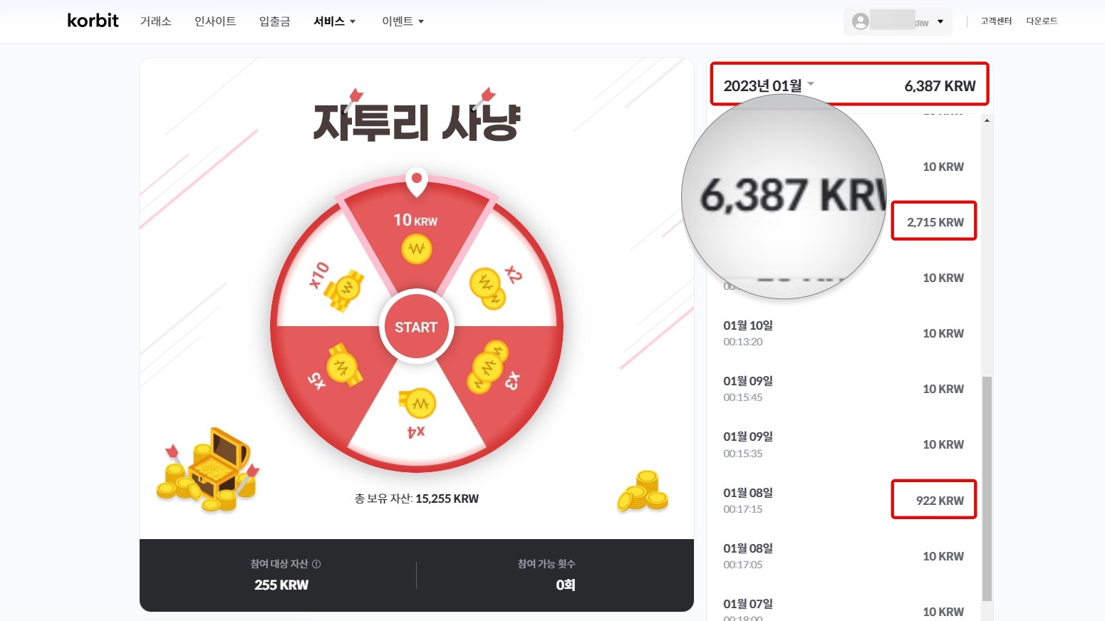 1월에 벌써 6,000원 이상 자투리 사냥으로 리워드를 지급받았네요, 900원 일 때 3배 나와서 2,715 받은 적도 있습니다. 10원이 자주 나오긴 하지만 2배, 3배도 종종 나오니 자투리 금액을 꼭 최대치로 올리고 돌리세요.