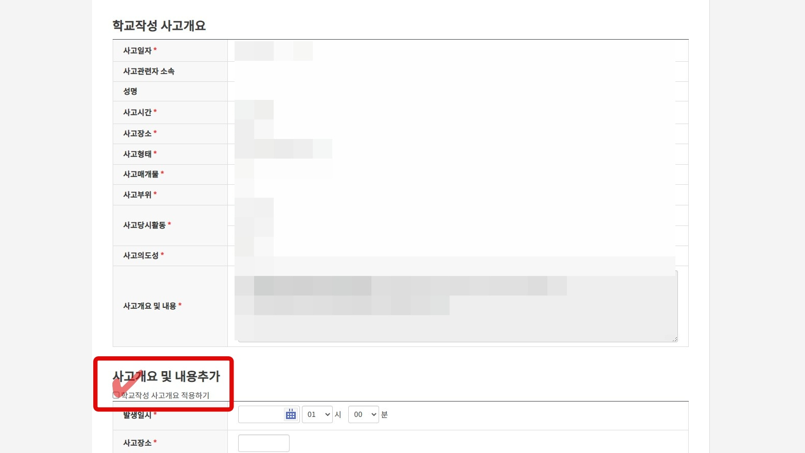 8. 학교에서 작성한 사고개요 내용을 확인하고 사고개요 및 내용추가에 학교작성 사고개요 적용하기를 체크합니다.