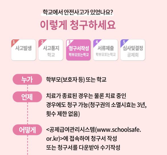 아이들이 안전하게 학교 생활을 할 수 있길 바라며, 혹시라도 학교 안에서 사고가 발생한 경우에는 보상 지원 시스템을 잘 활용하여 학생들이 빠른 시일 내에 치료를 받을 수 있도록 돕고, 보상금을 통해 경제적인 부담을 덜 수 있도록 학교 안전사고 보상 지원 시스템을 잘 활용하시기 바랍니다.