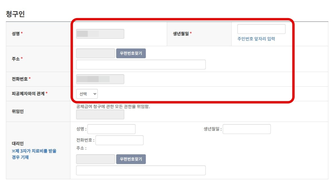 6. 공제 급여 청구 화면에서 청구인(부모) 성명, 생년월일, 주소, 전화번호를 입력합니다.