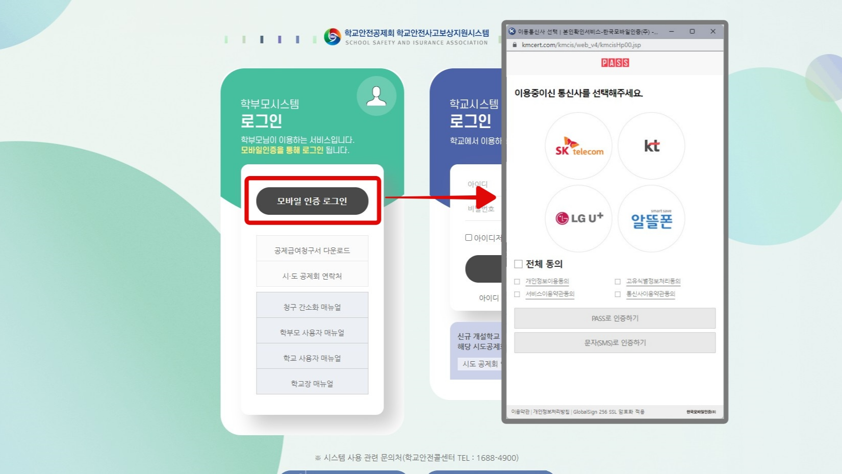 1. 학교안전사고보상지원시스템에 접속하여 학부모시스템에 모바일 로그인을 선택하여 본인인증 후 로그인합니다.